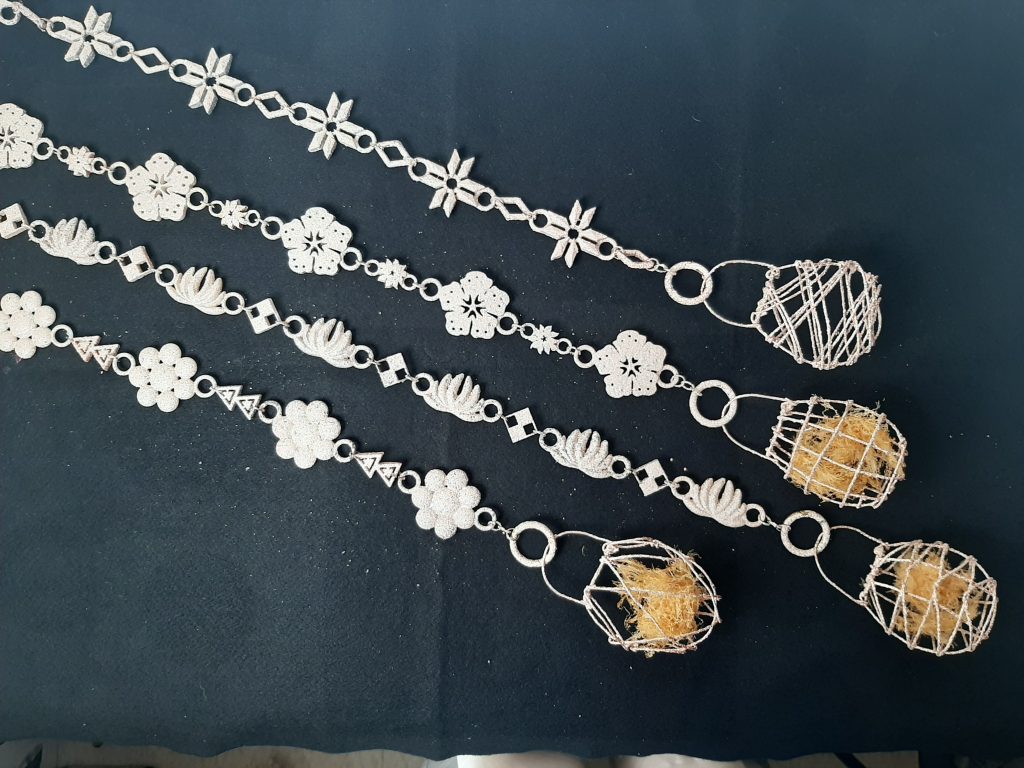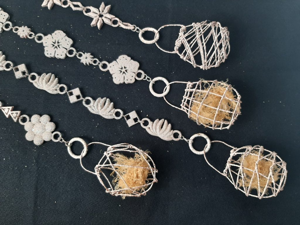 在田調中「有什麼印象深刻的事情嗎?」的回答中有提到偷偷帶東西出去的故事,所以將此故事融入網袋設計,分內外兩層–外為軟金絲,內為半透明袋,意為「偷偷」。